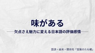感情系の慣用句 「味がある」の語源は“味わう力”──欠点さえ魅力に変える日本語の評価感情 「味がある」は、欠点や不完全さを含めて魅力として評価する日本語。語源をたどると“味わう”という身体感覚に行き着きます。意味の成り立ちと感情構造を語源から解説します。 感情系の慣用句