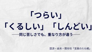 感情語の語源 「つらい」「くるしい」「しんどい」の違い──押される・塞がる・消耗する 「つらい」「くるしい」「しんどい」は似た表現に見えて、語源は異なります。強く押される負荷、息が塞がる圧迫、力が尽きる消耗感。語源から苦しさの違いを読み解きます。 感情語の語源